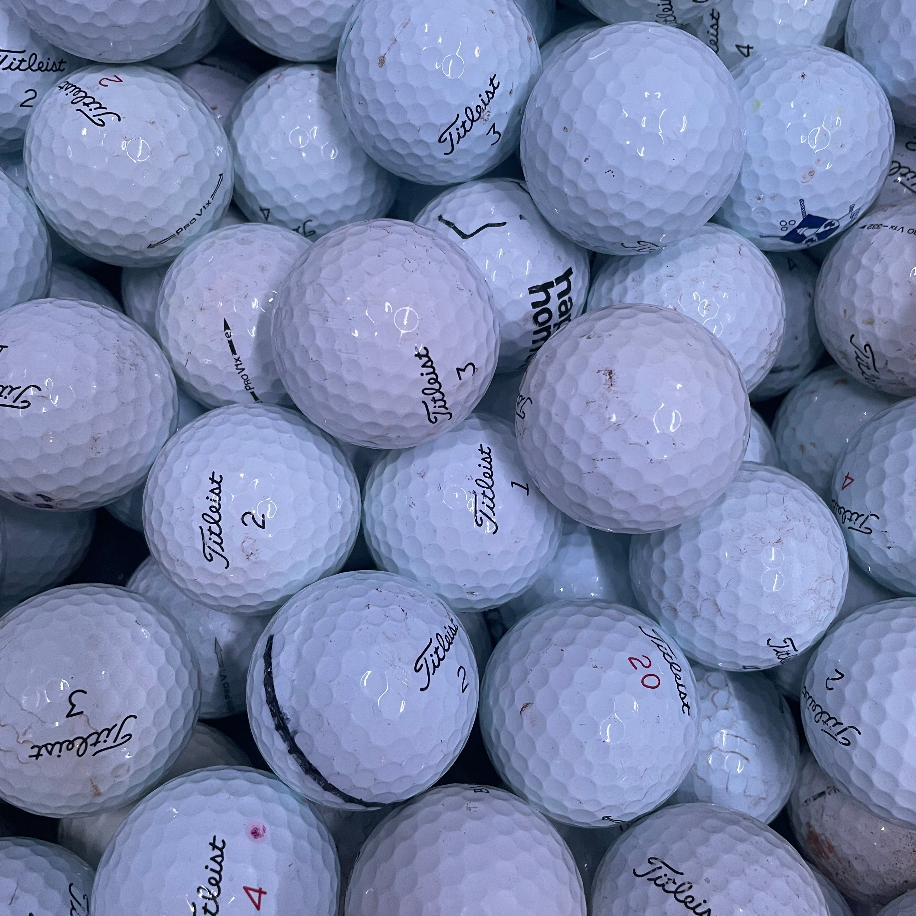 Bollarna har stora skrapmärken, stora nyanskillnader men är hela. Perfekt för dig som vill ha bollar att träna med eller inte behöva vara rädd för att slå bort.